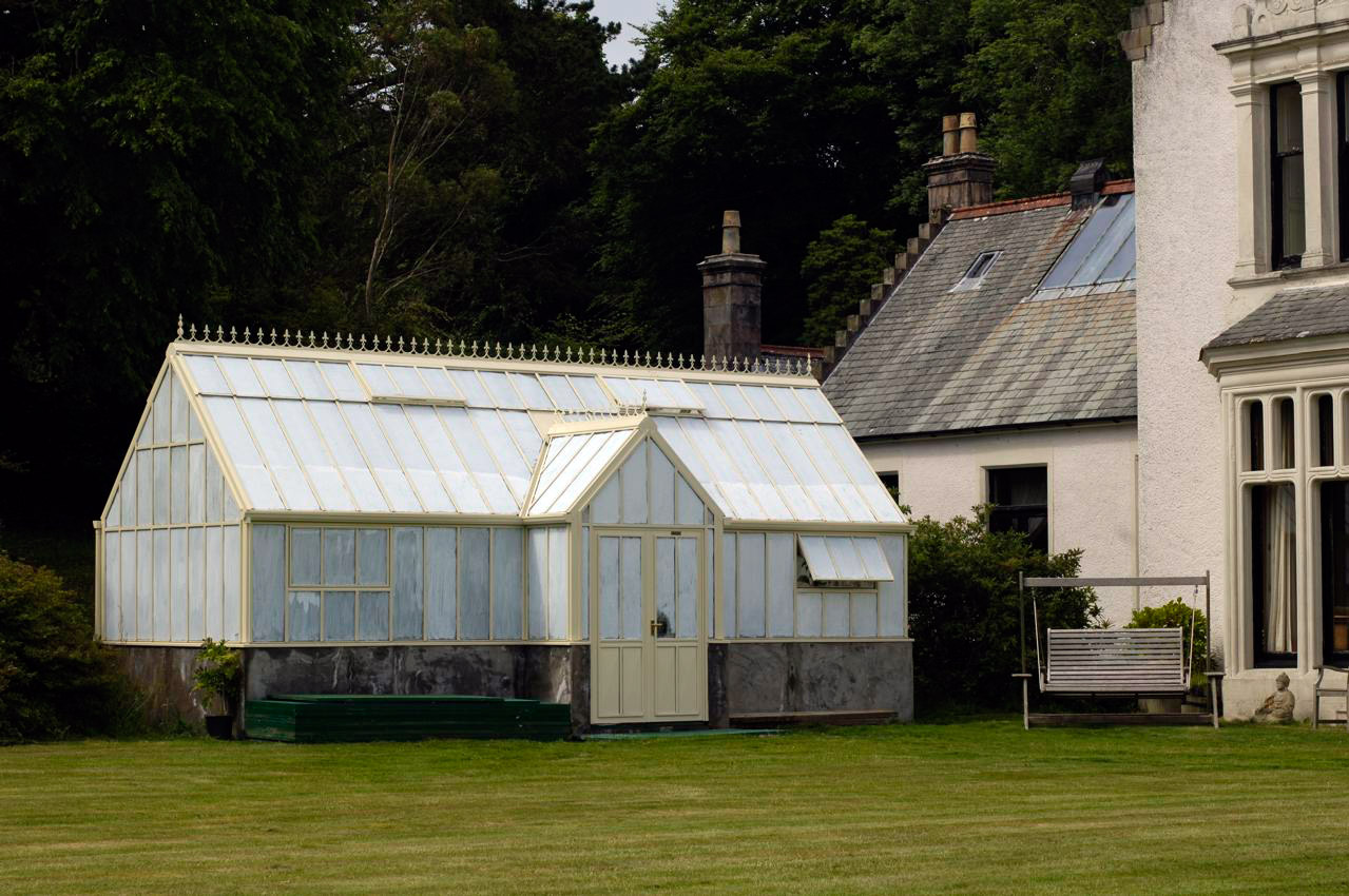 The two main types of tropical slipper orchids, the Paphiopedilums and the Phragmipediums, and the chief occupants of the intermediate section. Here is a photo of what the greenhouse will more or less look like when completed. And below it is a photo of the construction site in early December 2007, showing the blockwork going up. As the greenhouse will be next to Achamore House, which is a Grade B Listed Building with rendered stone construction, we are using concrete blocks for the low wall, which will be rendered in keeping with the house. (So you won't see bricks in our greenhouse, unlike the smaller photo here.)