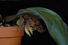 The inflorescence of Bulbophyllum is not pleasant to our noses, and its stink has been likened variously to that of rotting flesh, or the bottom of a bird's cage. The bloom is about the size of a grapfruit overall, and lasts for about one week.